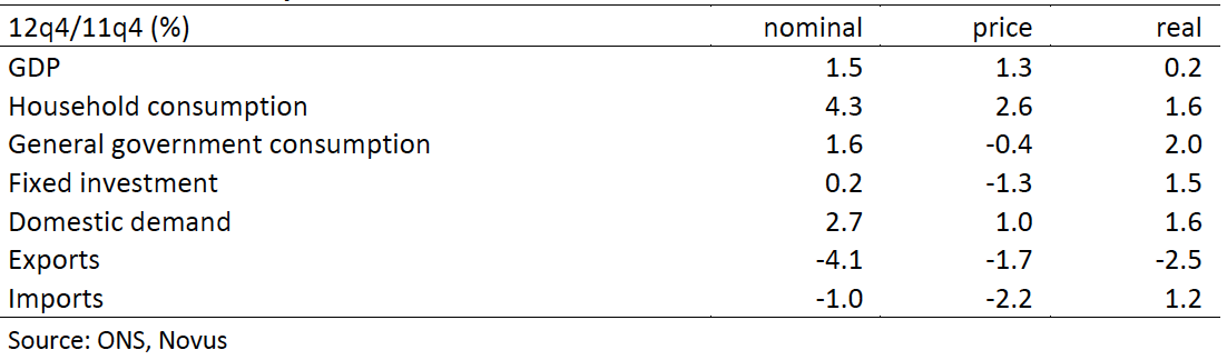 Since the biggest single contribution to GDP growth last year came from the consumer and since that was income based (boosted by a 0.9% fall in taxes on income and wealth), it is hard to discern much of a contribution from monetary policy. Low interest rates have contributed by keeping household mortgage payments down (though at the cost of a significant hit to savers’ incomes) and QE may have had an effect on business investment by boosting share prices. But it is hard to see that the fall in the exchange rate, even allowing for the fact that some of the fall was reversed last year (though it has been re-reversed this) has done much for exports. Or at least what boost it has provided has been wiped out by recession in the euro area.